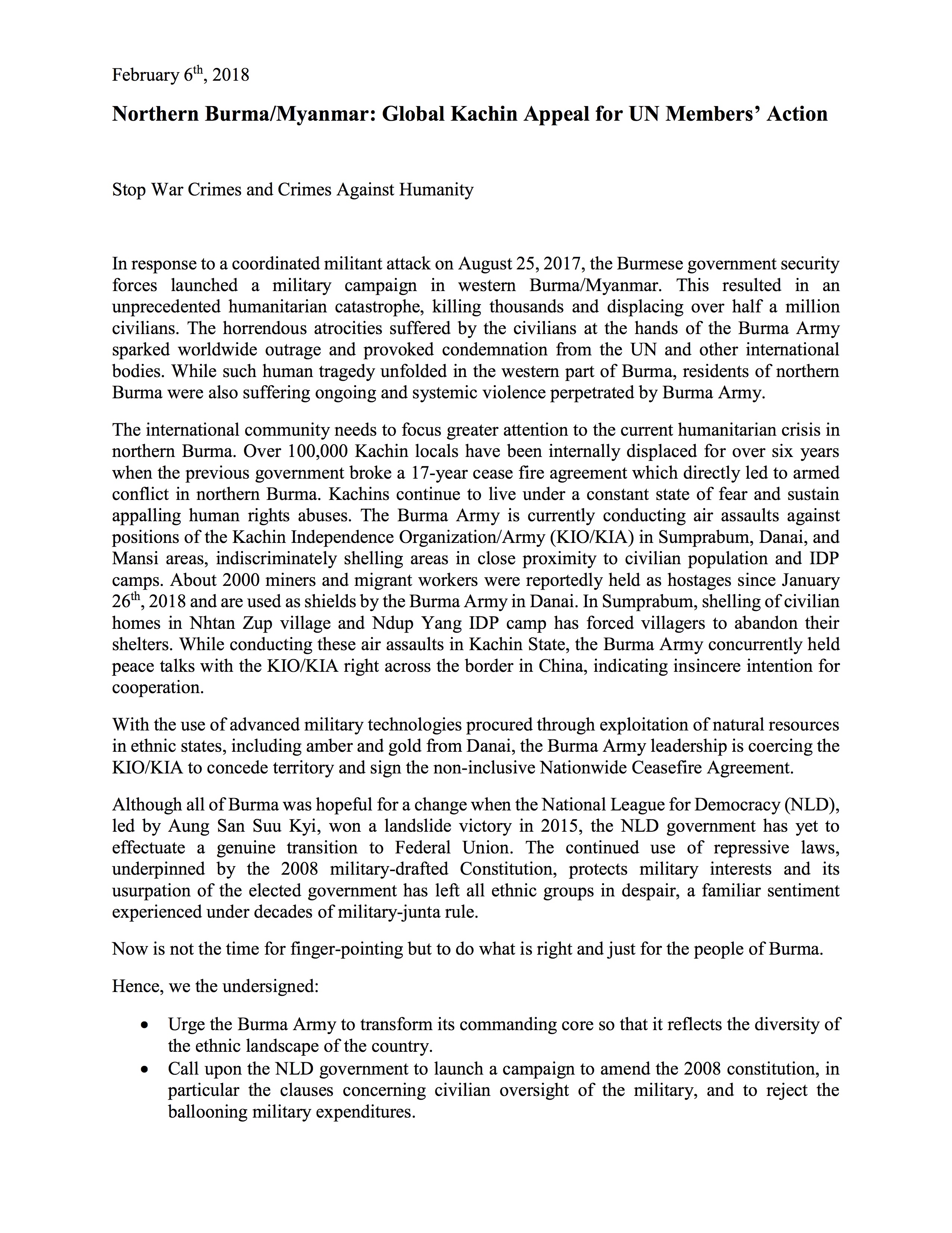 Northern Burma/Myanmar: Global Kachin Appeal for UN Members’ Action by Kachin Alliance February 6, 2018 February 6, 2018 0 comments 346 Kachin Alliance previous post Statement Condemning Tatmadaw Airstrikes Against Unarmed Civilians next post Kachin Communities Worldwide Demand United Nations Security Council Urgently Refers Burma to the International Criminal Court – 23rd April 2018 You may also like Fourteenth Anniversary of the Resumed War in Kachin October 12, 2025 Fourteenth Anniversary of the Resumed War in Kachin June 9, 2025 Statement on the Military Junta’s Continued Airstrikes Amid Earthquake Disaster April 2, 2025 Kachin Alliance’s Open Letter to Committee Representing Pyidaungsu Hluttaw March 2, 2021 Kachin Alliance’s Statement (Sept 1, 2019) September 2, 2019 Nationalities Alliance’s Statement June 19, 2019 Leave a Comment Cancel Reply Save my name, email, and website in this browser for the next time I comment.